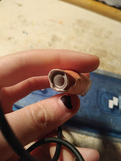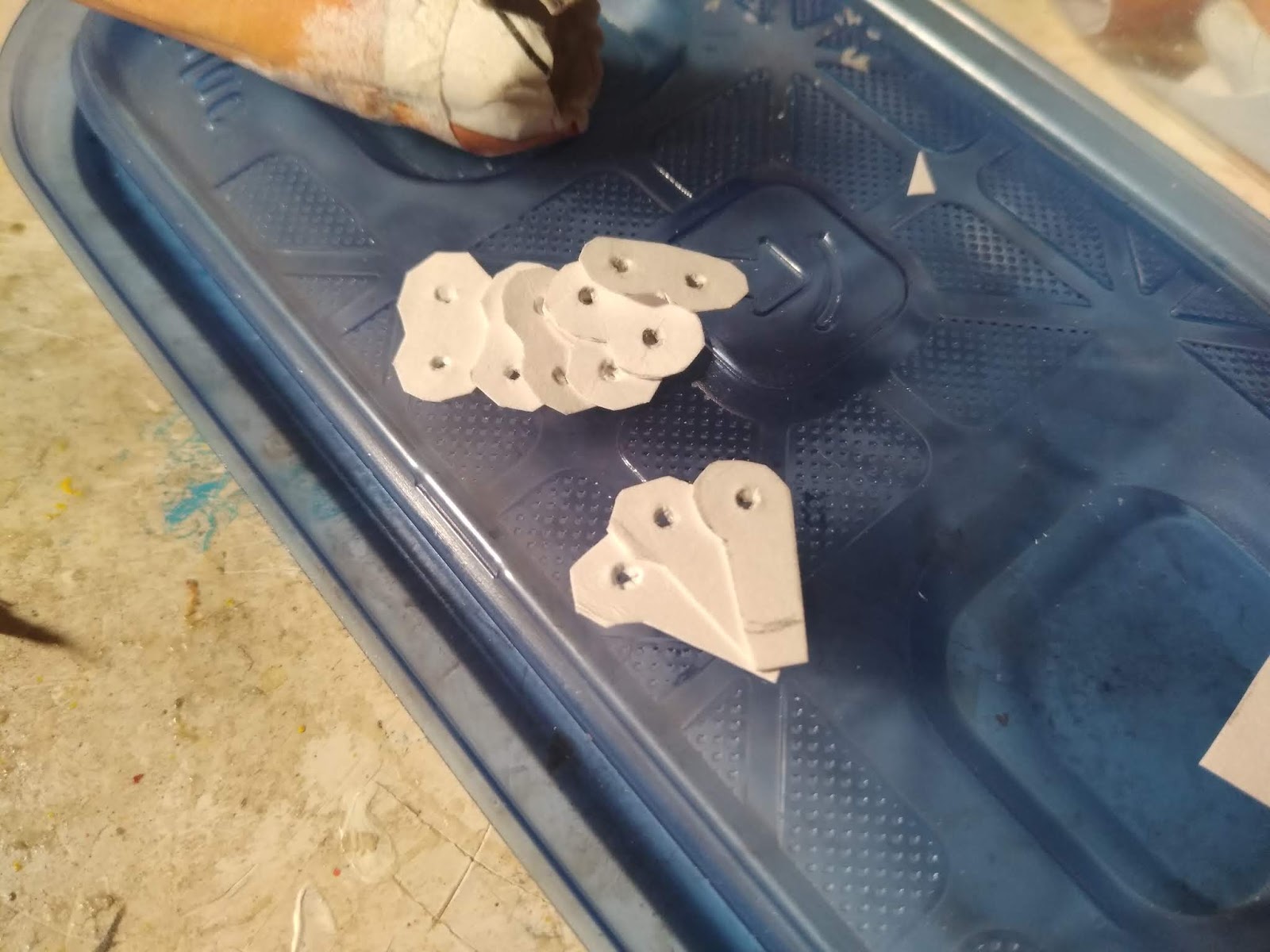 Oh, and you're going to need.... About 21 more dryer heads. It takes six to make ONE HALF of ONE knee joint. So once that's done, and you've cut and glued together the wedges, glue the wedge to one half of the dryer head and let it dry. And repeat with the other piece.